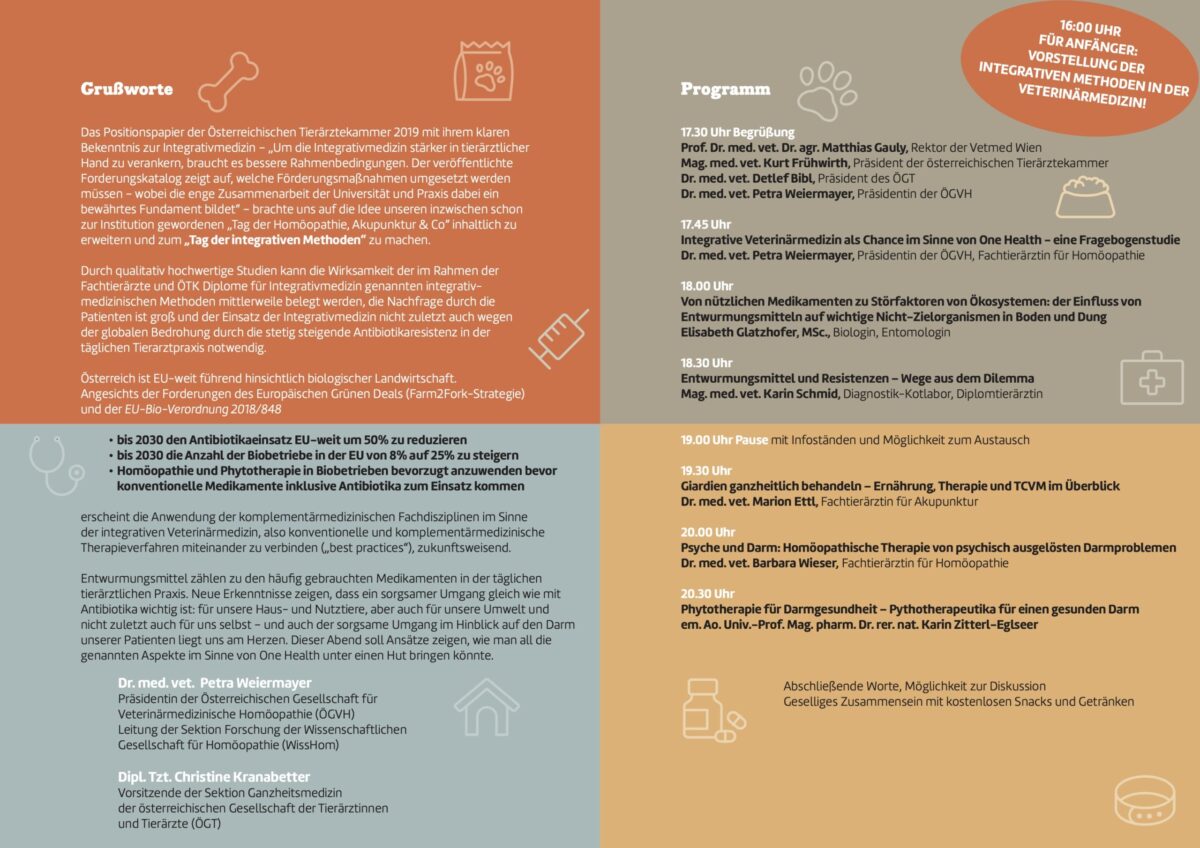 Das Thema ist hochaktuell und die Vorträge sind gleichermaßen relevant für Tierärzt:innen, Pharmazeut:innen und Studierende, aber auch für Tierhalter:innen. Wir würden uns sehr freuen, wenn Sie in Ihrem Umfeld und in Ihrer Ordination auf die Veranstaltung aufmerksam machen. Den Flyer stellen wir Ihnen hier zum Download zur Verfügung, gedruckte Exemplare senden wir Ihnen auf Anfrage gerne zu. |
